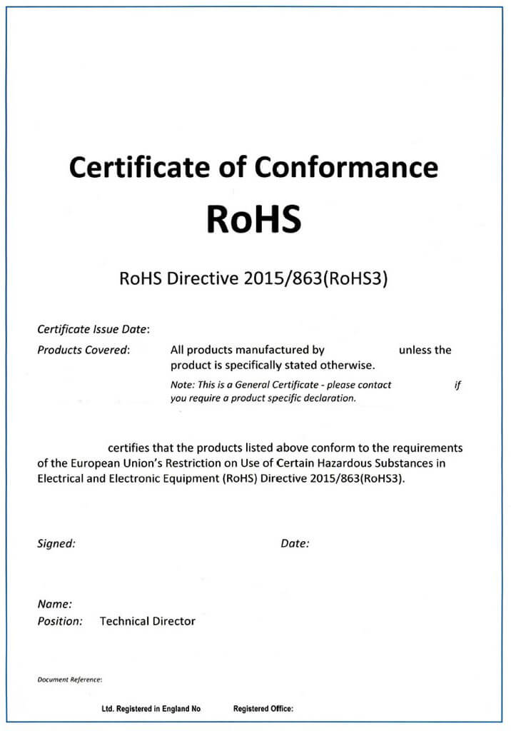 Please note that this is a self-declaration, so it must get signed by you or one of your employees, indicating that the product complies with all requirements of RoHS and will bear all responsibilities related to it.