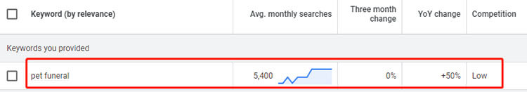Niching down is to avoid highly competitive markets while ensuring there is enough demand in the chosen niche. Use tools like Google Keyword Planner to check the search volume of your niche keywords. Avoid choosing keywords with very low search volume, like a few dozen searches, which are too tiny to make money and grow your dropshipping business. Here is the search volume of pet funerals.