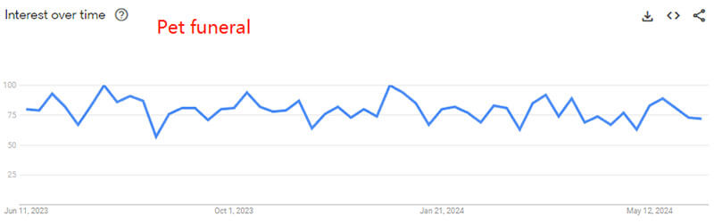 Many niche markets today are broad, like pet supplies, which have become saturated with many well-established businesses. Some people choose to focus on subcategories like chicken and goose clothing, shoes, toys, etc. Some choose the emerging niche of pet funerals. Google Trends shows there has been stable search interest in pet funerals over the past year, with Canada, the US, and Singapore as the top audiences.